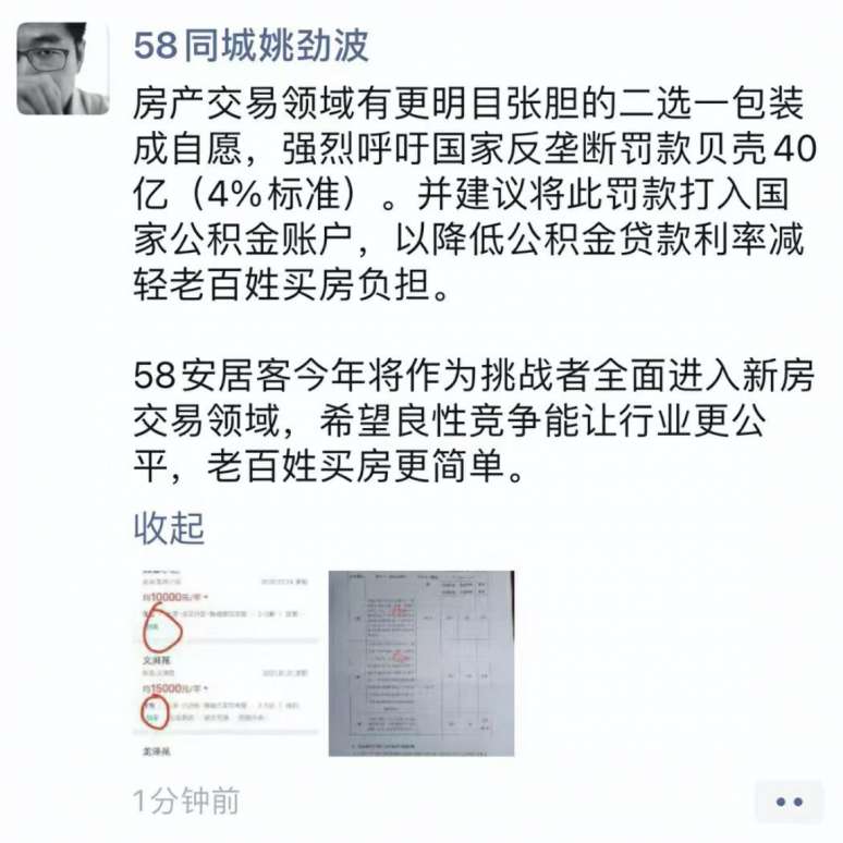 4月10日,阿里因为“二选一”垄断收到监管182.28亿罚单的消息传出后不久,姚劲波就在社交媒体蹭了一把热度,作为58同城的创始人和知名企业家,公开举报了竞争对手贝壳的垄断行为。