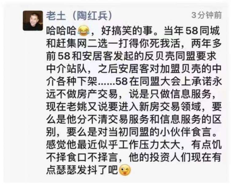 刺向贝壳的同时,姚劲波还宣布“58安居客今年将作为挑战者全面进入新房交易领域“。链家董事、前链家高级副总裁陶红兵随后在朋友圈评论:“以前姚劲波承诺永远不做房产交易,现在他食言了。”其还称,“感觉他(姚劲波)最近工作压力太大,有点饥不择食口不择言。”