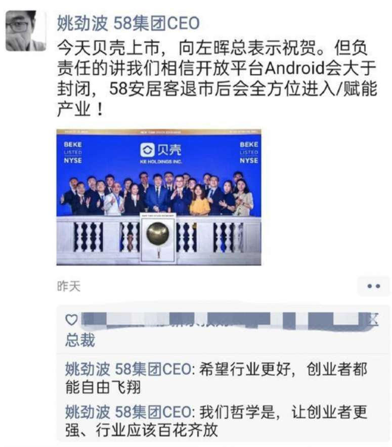 贝壳上市后受捧,据说姚劲波发了一条朋友圈,“今天贝壳上市,向左晖总表示祝贺。但负责任地讲,我们相信开放平台Android会大于封闭,58安居客退市后会全方位进入/赋能产业!”