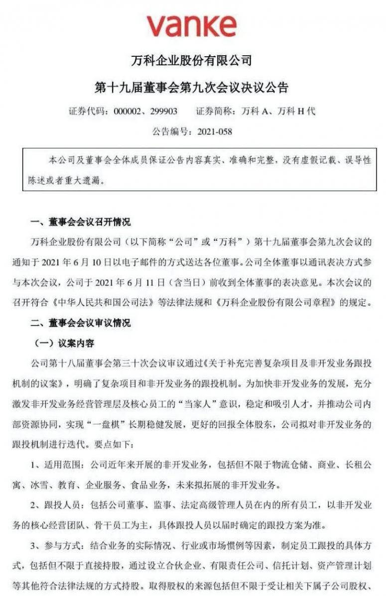 然而还不到三个月,6月14日,万科宣布将对非开发业务的跟投机制进行迭代,拟修订2020年5月提出的《关于补充完善复杂项目及非开发业务跟投机制的议案》(下称“《议案》”)。