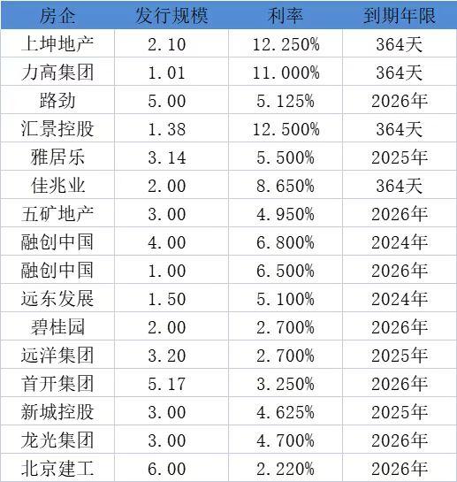 其中20日早间,上坤地产公告发行规模为2.10亿美元的绿色票据,发行利率12.25%,较此前发行利率的12.75%有所下降。力高集团发行规模为1.008亿美元,发行利率为11%。值得注意的是,两只美元票据发行期限均为364天。