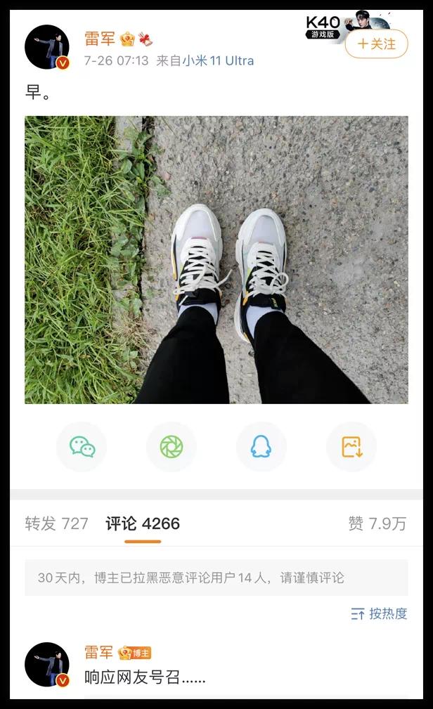 7月26日一早,小米总裁雷军在微博晒出一张穿着鸿星尔克鞋的图片,并评论称“响应网友号召”。