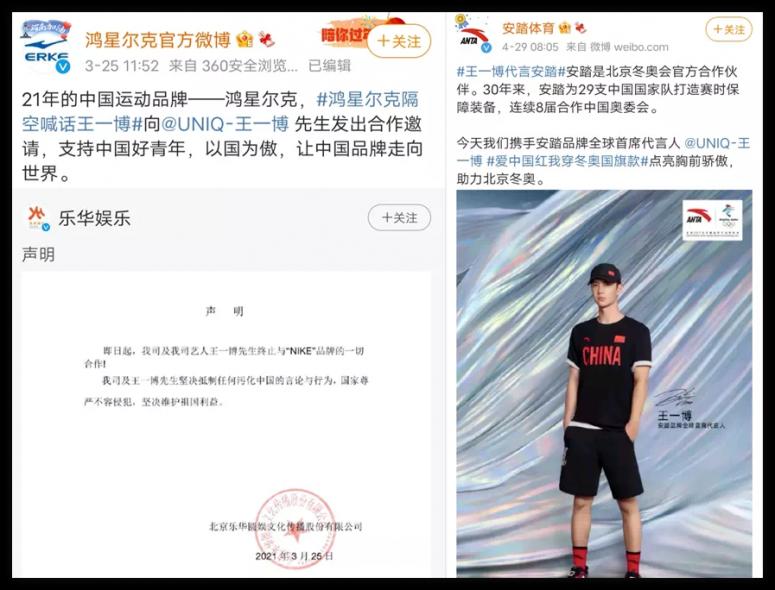 3月25日,在王一博宣布与耐克终止合作之后。鸿星尔克即刻出来喊话:鸿星尔克向王一博先生发出合作邀请,支持中国好青年,以国为傲,让中国品牌走向世界。