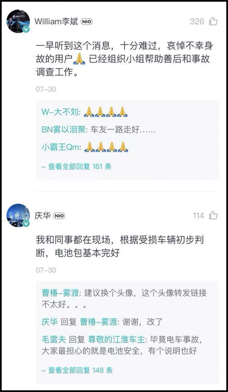 当日中午,蔚来上海区域公司总经理夏庆华在蔚来App进行了事故说明,蔚来汽车创始人、董事长李斌也第一时间在该说明下回复称,已组织小组帮助善后和事故调查工作。此外,夏庆华还增加了一条回应:根据受损车辆初步判断,电池包基本完好。其意图旨在第一时间撇清关系,表明这起事故并非电池导致的自燃。