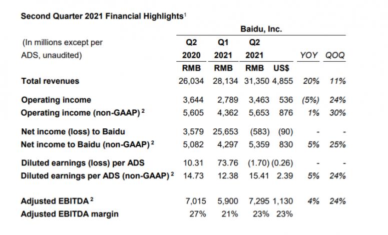 8月12日,百度发布了2021年二季度财报,财报显示,百度该季度总收入为314亿元人民币,同比增长20%,归属百度的净利润(非美国通用会计准则)54亿元,同比增长约5%。