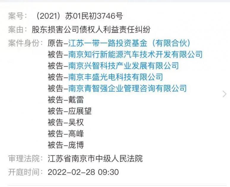 值得一提的是,作为拜腾B轮融资的投资方,江苏“一带一路”投资基金以“股东损害公司债权人利益责任纠纷”,将南京知行新能源汽车技术开发有限公司等公司及高管进行了起诉,开庭时间是2022年2月28日。