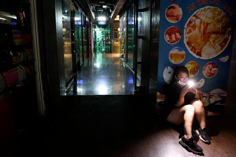 2023年5月13日,台湾遭遇大停电,图为台北商场内一名女子在黑暗中使用手机。