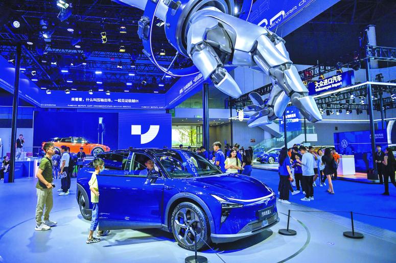 2023年8月29日,四川成都举行的第二十六届成都国际汽车展览会现场,极越汽车机器人引参观者驻足。
