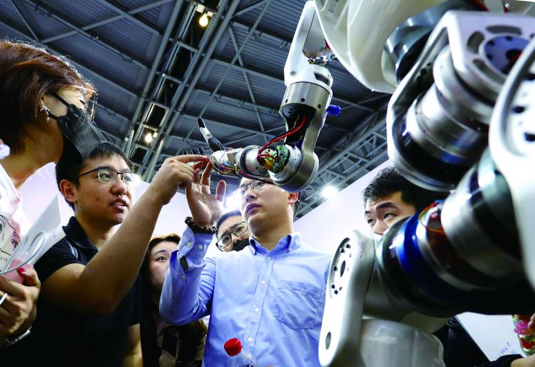 2023年7月6日,参观者在2023世界人工智能大会展会现场的智能机器人展品旁交流。