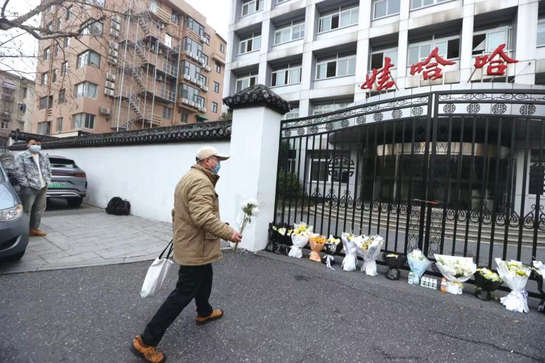 2024年2月25日,位于杭州上城区清泰街160号原娃哈哈总部门前,许多员工和市民冒着寒风自发前往悼念宗庆后。