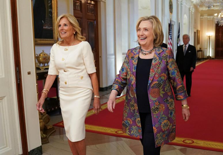 2023年9月12日,美国前国务卿希拉里·克林顿和美国第一夫人吉尔·拜登抵达白宫,出席日本艺术协会的一场颁奖典礼。
