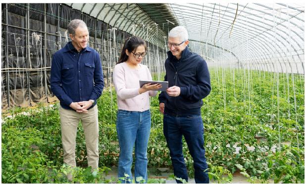 其次,相比在各大Apple零售店会见员工和粉丝,在农场,库克和来自中国农业大学和浙江大学的学生们见面,并且探讨了如何利用iPhone和iPad等产品促进高效、可持续的农业实践。而在去年,苹果曾向中国乡村发展基金会捐款2500万元,以帮助农民和教育者。