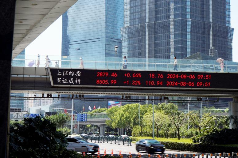 2024年8月6日,上海陆家嘴,过街天桥的屏幕上展示着当日股票信息。