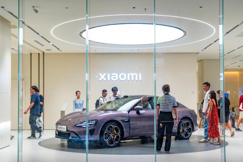 2024年8月29日,武汉,小米门店里面众多消费者在参观体验小米SU7新能源汽车。