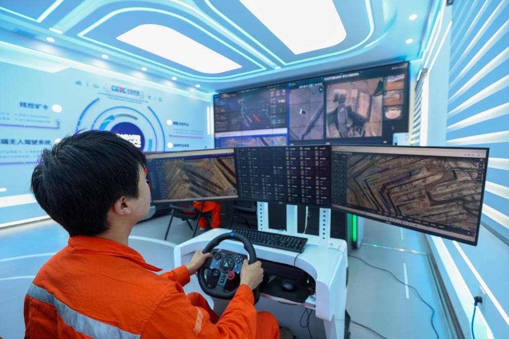 新疆准东宜化五彩湾一号露天煤矿的控制中心内,驾驶员在通过智能系统远程监控无人矿卡有效运行。