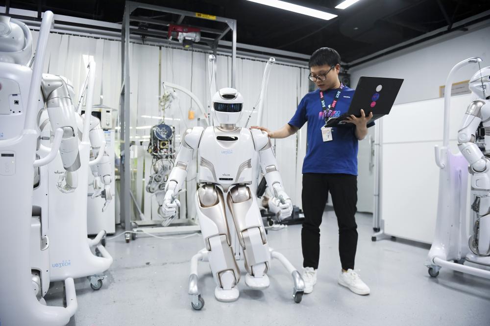 这家总部位于杭州的公司正在展示其致力于改变新兴行业、打造人形机器人的雄厚实力。这些机器人由开源软件驱动,买家可以编写代码让它们奔跑、跳舞或做出武术回旋踢。