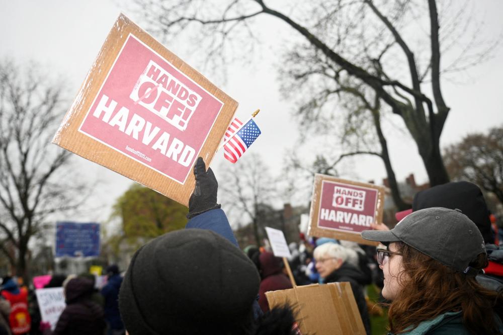 2025年4月12日,美国马萨诸塞州剑桥市,示威者举行集会,呼吁哈佛大学领导层抵制美国联邦政府的干预。