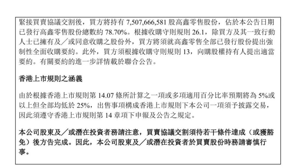 紧接着,1月1日,阿里又发布公告称,子公司及New Retail与Paragon Shine Limited订立协议,出售所持高鑫零售全部股权,占高鑫零售已发行股份总数约78.7%,阿里子公司及New Retail将有权就待售股份收取最高金额为131.38亿港元。