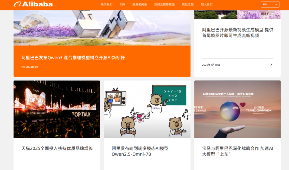 《凤凰WEEKLY财经》注意到,目前阿里巴巴集团官网首页几乎全部与AI内容相关,如阿里巴巴发布Qwen3 混合推理模型树立开源AI新标杆、宝马与阿里巴巴深化战略合作加速AI大模型“上车”等,可见阿里对AI布局的重视程度。