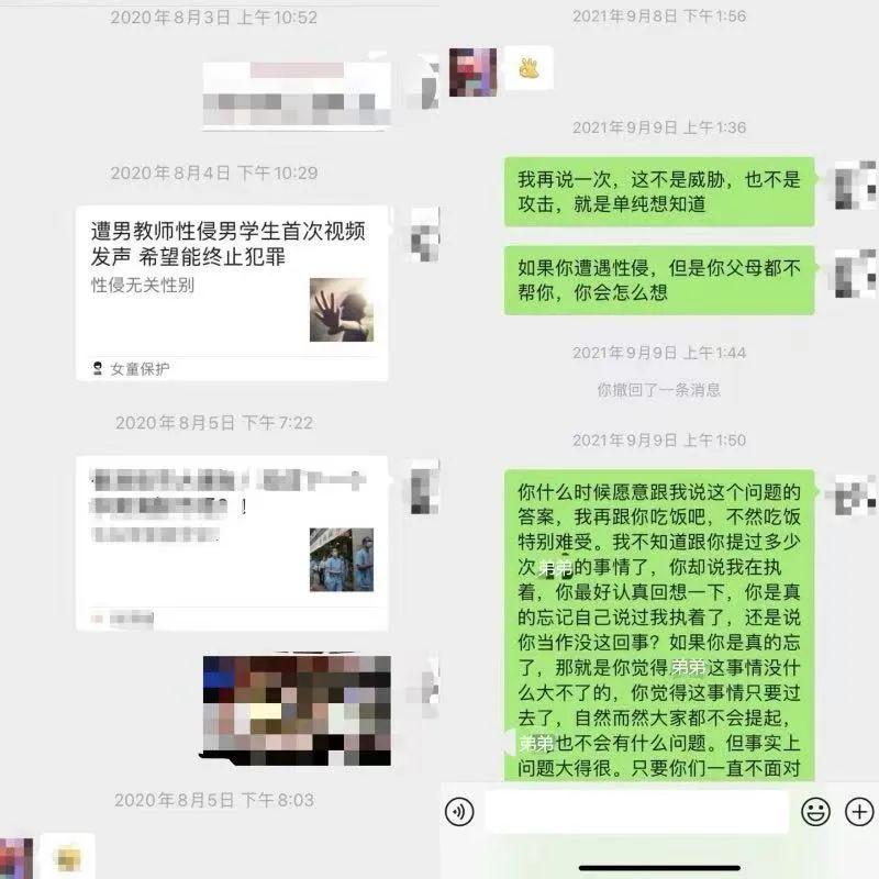 得知宋辰的遭遇后,宋海江不是没有变化。他第一次主动参加了儿子学校的家长会,有空也会接送他上下学。但宋欣觉得这些不够,她开始在大学里留意性科普相关讲座,带宋辰一起去听。她还辅修了心理学,学习有关心理创伤相关的知识。看到有关性侵的文章,比如韩国电影《熔炉》的影评,房思琪相关新闻,林肯公园主唱(儿时候曾遭遇过来自成年男性的性侵)自杀的消息,她都会转发给父母,希望他们意识到宋辰的遭遇并不是简单的“玩玩而已”。她试图说服父母,要让宋辰接受专业的心理咨询。