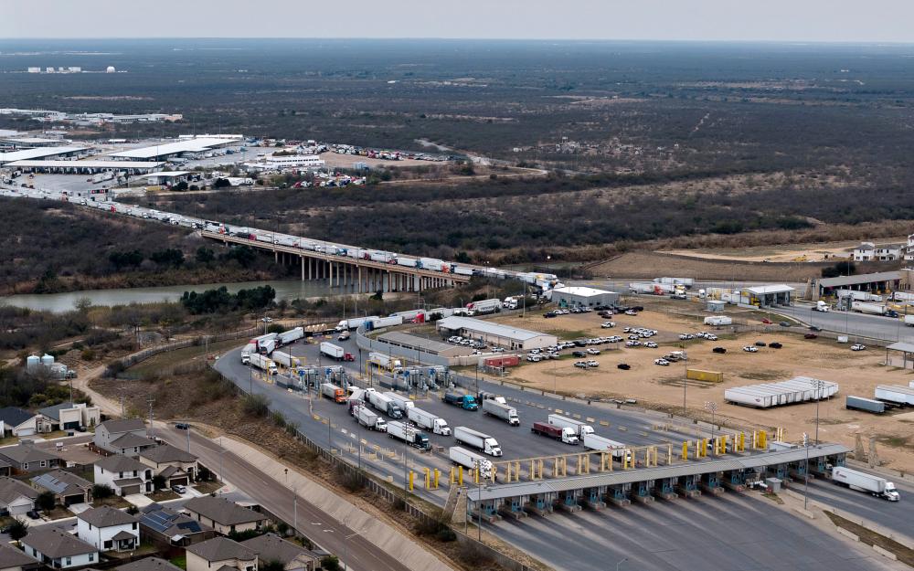 2025年2月20日,卡车在得克萨斯州拉雷多的世贸大桥入境口岸排队进入美国。