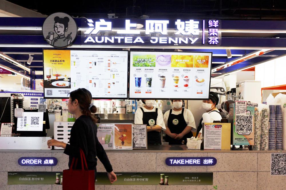 2024年9月19日,北京一家购物中心内,一名顾客走过一家沪上阿姨门店。