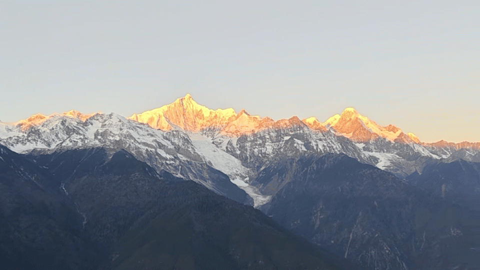 抵达梅里雪山是在大年初一早上八点十几分——鼬鼬清晰地记得这个时间,他在飞来寺观景台亲眼见到,朝阳将冷白的雪山一点点染成耀眼的金黄,衬着灰蓝色的天幕,庄严又壮阔。