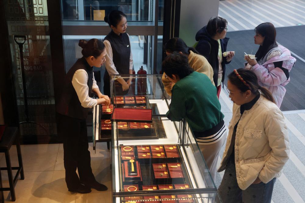 2025年3月12日,北京一家老铺黄金珠宝店的工作人员正在接待顾客。