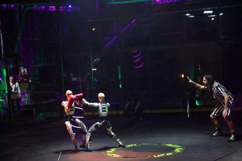 擂台上,身着黑白条纹衫的真人裁判,像对待真实拳手一样对两个双足机器人发号施令,引得约150名在消费电子展期间顺道而来的好奇观众忍俊不禁。