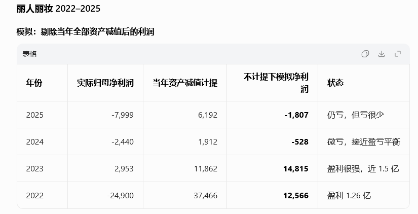 2022年,丽人丽妆财报显示巨亏近 2.5亿,剔除计提部分,其还有1.26亿元利润;2023 年,是这四年里丽人丽妆主业最强的一年,即使计提1.19亿元的情况下,利润还有近3000万;2024年财报显示当年亏损2440万元,即使剔除计提的1912万元,亏损528万元;到了2025年,丽人丽妆亏损大幅提升至近8千万元,剔除计提6191万元,依然亏损1800万左右。