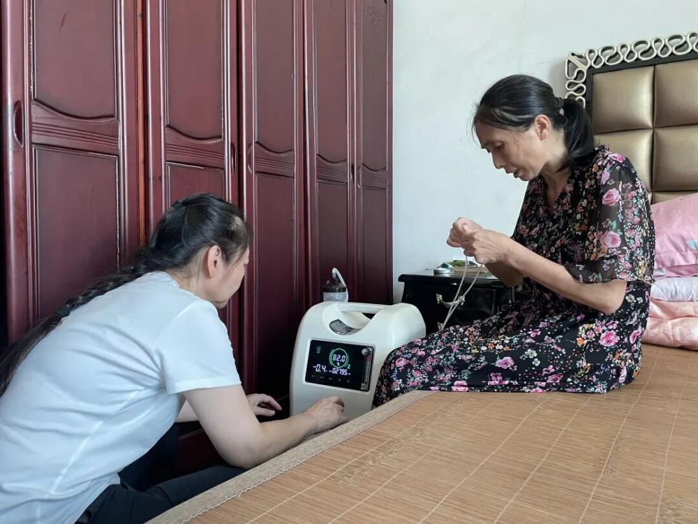 “大爱清尘”的志愿者在帮着杨洁如合使用制氧机。