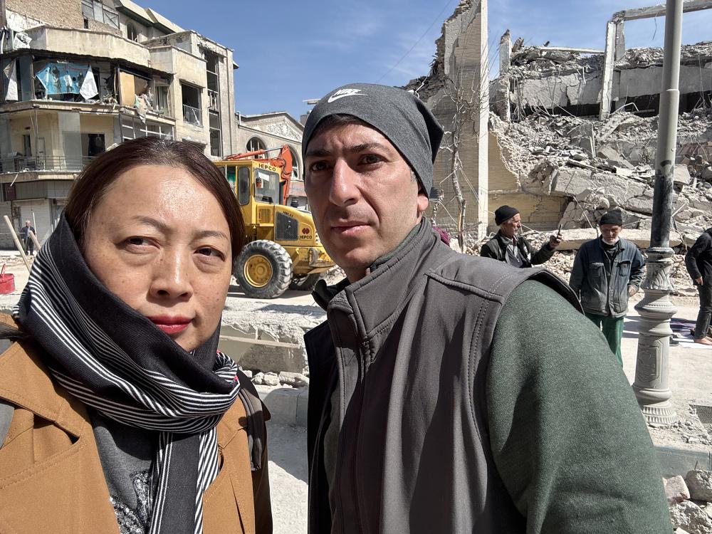 2026年3月3日,伊朗德黑兰,革命广场对面的警察局大楼被炸,凤凰卫视记者李睿和摄影师伊朗人穆森在现场采访。