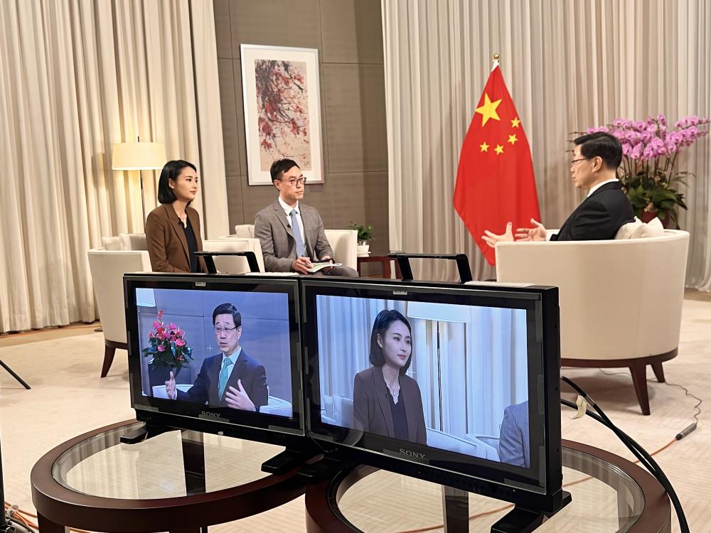 2023年10月25日,香港特区行政长官李家超发表任内第二份施政报告。随即在翌日,李家超接受凤凰卫视记者独家专访,这也是报告发表后他接受的首个媒体专访。报告首次明确基本法第23条立法的时间表,李家超向记者详细阐释施政思路,并就中美政治博弈下香港的发展路向作出解读。