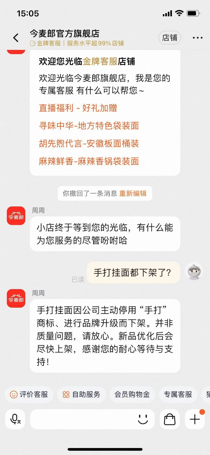 4 月 2 日,《凤凰 WEEKLY 财经》在今麦郎天猫旗舰店检索 “手打” 相关产品,已无相关结果。店铺客服表示,手打挂面因公司主动停用已下架。