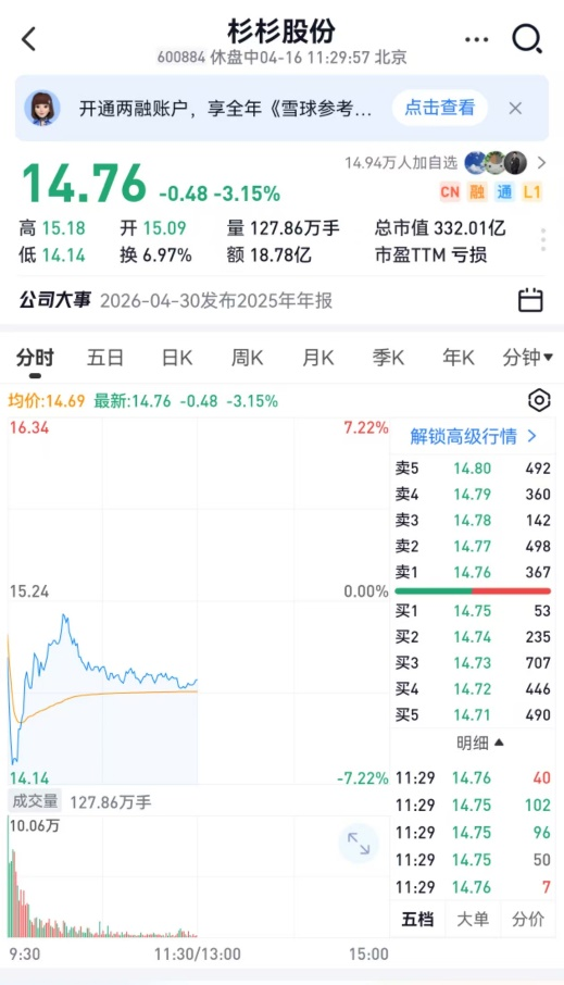 截至2026年4月16日中午休盘,杉杉股份股价下跌3.15%,报14.76元/股,市值为332.01亿元。