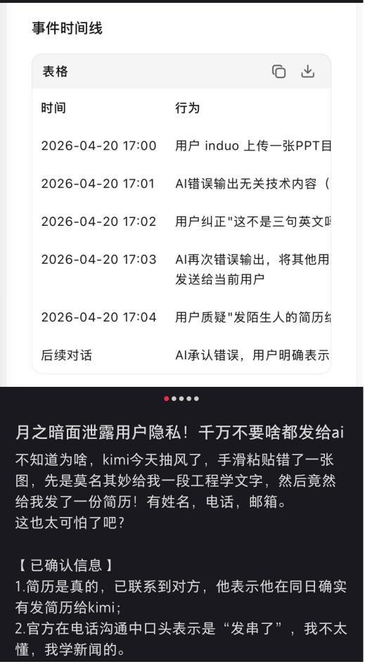 4月20日,有用户在社交平台称,AI产品Kimi(月之暗面开发)疑似泄露用户隐私。