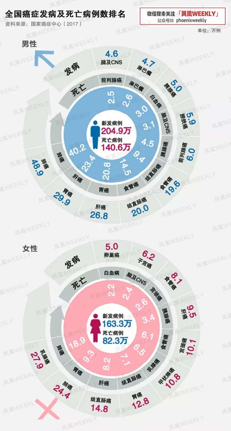 2013年,中国估计新发恶性肿瘤病例368.2万,死亡222.9万。其中,男性恶性肿瘤发病率和死亡率均明显高于女性,且男性多发肺癌、胃癌、肝癌,女性则多为乳腺癌、肺癌和结直肠癌。