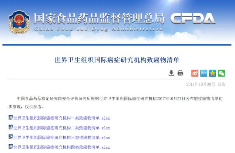 2017年10月30日,国家食品药品监督管理总局在官网上发布的致癌物清单,便是根据国际癌症研究机构公布的资料整理而成。