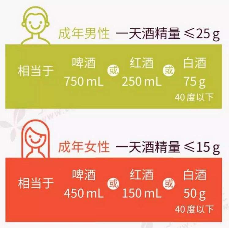 美国酒精滥用和酒精中毒机构推荐每日摄入酒精量不超过14g,相当于不到1两白酒,3两红酒或1听啤酒。