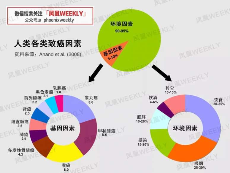 美国MD安德森癌症中心研究显示,只有5%-10%的癌症病例与基因缺陷有关,其余90%-95%的癌症源于不良环境和生活方式,包括饮食、吸烟、感染、肥胖、酒精等,其中饮食与癌症的关系最为紧密。