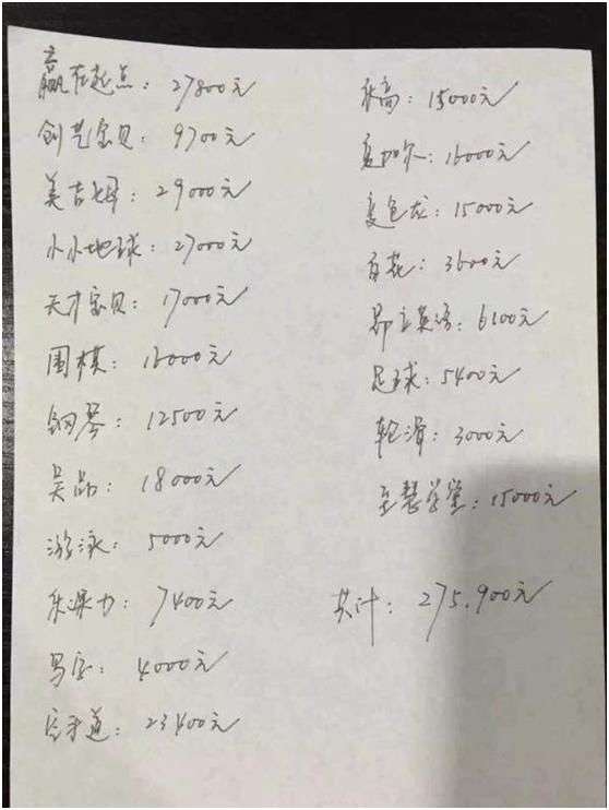 其他还有游泳课、英语、奥数、作文培训班,一共8000元。