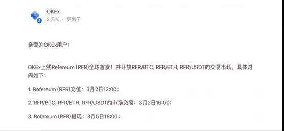 3月2日,数字货币交易所OKEX官方宣布上线了RFR代币,这就相当于股票已经正式在二级市场流通,一级市场的投资者们仍然没有拿到币。
