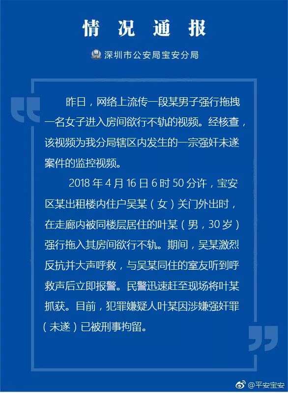 这是深圳某小区的一段监控视频,据警方通报,听到女子呼救后,同住的室友立马报警,警方迅速到达现场将男子抓获,最终男子因涉嫌强奸罪(未遂)被刑事拘留。