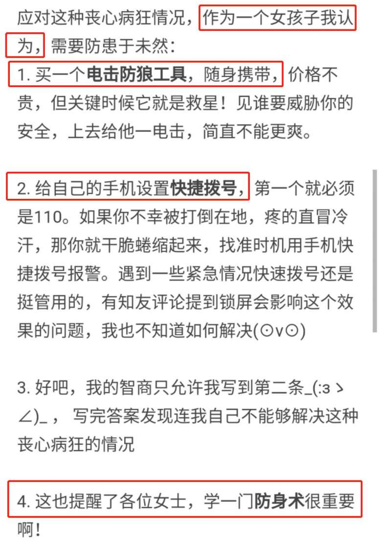 在知乎上关于“女生独自在公众场合被陌生人强行拖走怎么办?”的话题讨论中,点赞排名第二的回答中,就做出了如下建议。