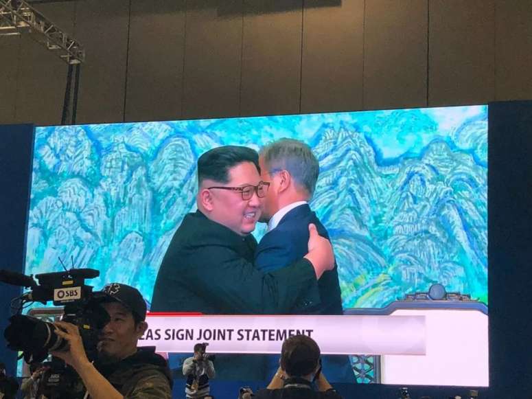 最开始的气氛有些紧张。当金正恩的身影出现后,文在寅和多位部长迎着他走过去,步伐逐渐加快。快见到时,双方笑着伸出了手。握手的一霎那,有韩国记者在媒体中心内带头鼓起掌来,外媒则保持了相对克制。