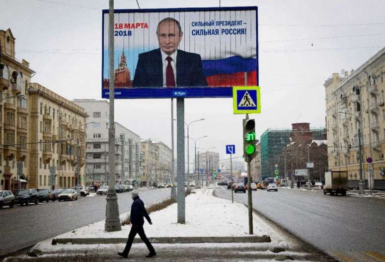 行人经过印着俄罗斯总统普京的广告牌,上面写着“强大的总统,强大的俄罗斯”。俄罗斯总统大选已于2018年3月18日举行。