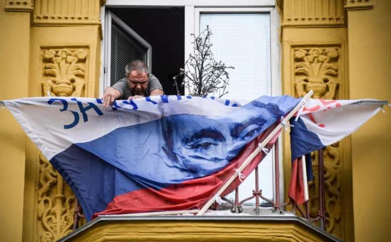 莫斯科一男子将普京的竞选旗帜挂在自家阳台上。