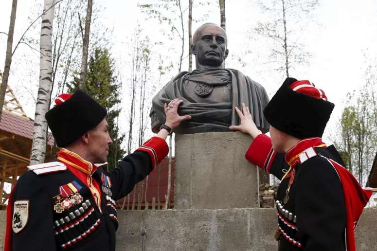 两个哥萨克人站在普京半身像旁,这个雕像把普京形容为“罗马皇帝”。