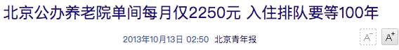 之前有媒体报道,北京一家公办养老院,价廉物美,单间只要2250元一个月,双人间每人只要1200元,但入住却要排队等100年。