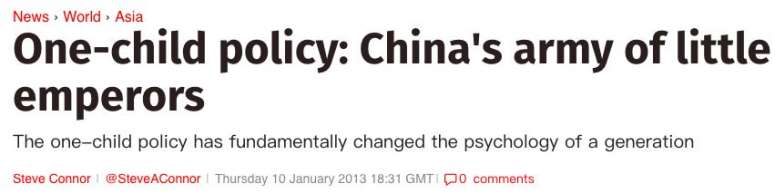 英国《独立报》一篇题为“独生子女政策:中国的小皇帝们”的报道中,将独生子女一代形容为“受溺爱、被宠坏、以自我为中心”的人。